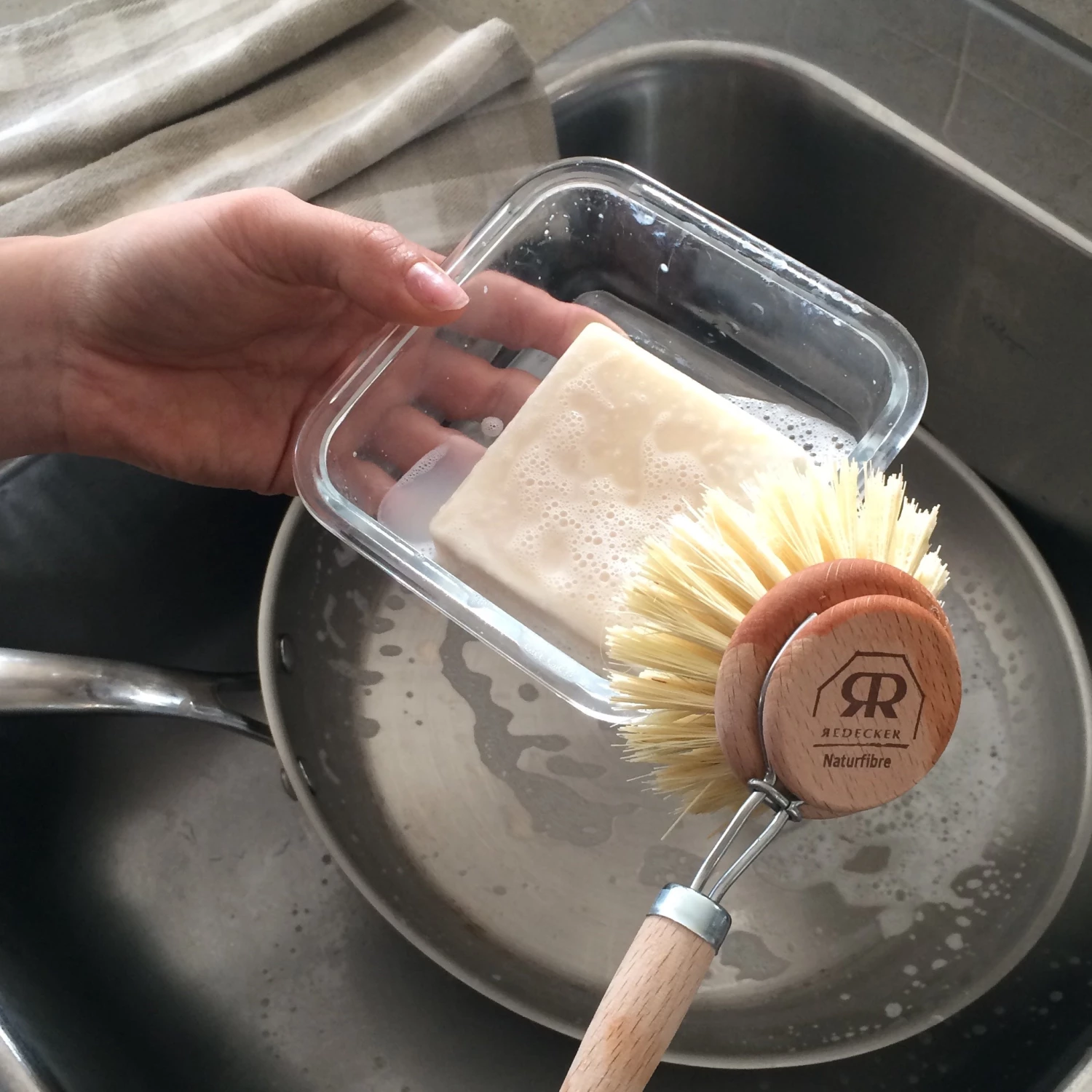 When it comes to zero waste, nothing beats bar soap. We love this versatile and long-lasting household soap, and use it for everything, including our dishes. It foams nicely and is great to remove grease and sticky food residue.