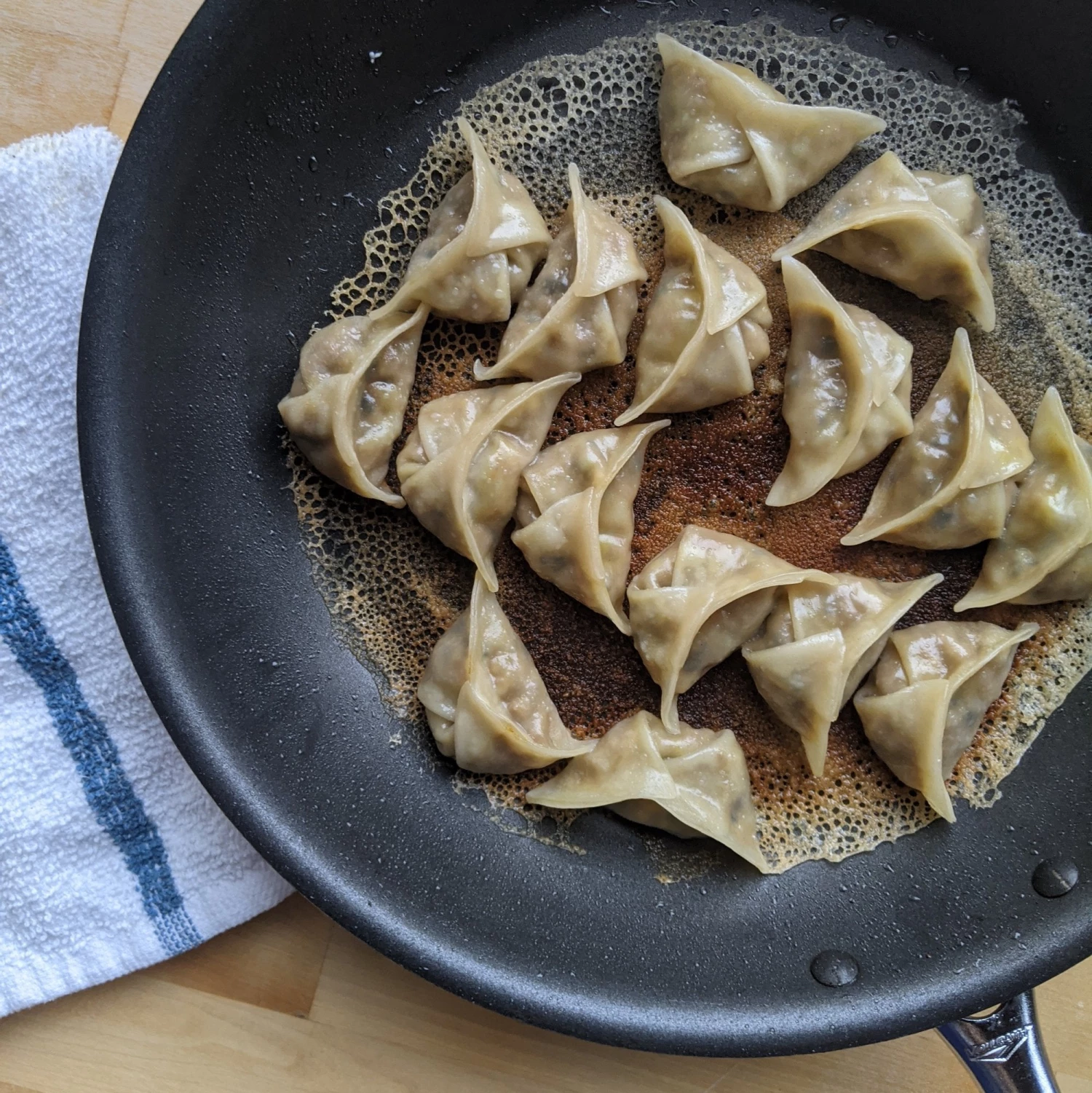 - Gather: 1 tsp vegetable oil, 1/2 tsp sesame oil (or use veg oil), 1/2 cup water, large frying pan with lid, ideally non-stick. For crispy Winged Dumplings (direct translation of the Japanese “Hanetsuki”), prep a smoothly whisked slurry of 1 scant cup water, 1/2 Tb flour and 1/2 Tb cornstarch. 1 Tb of flour if you don’t have cornstarch. Result will be less lacy and more sturdy.)