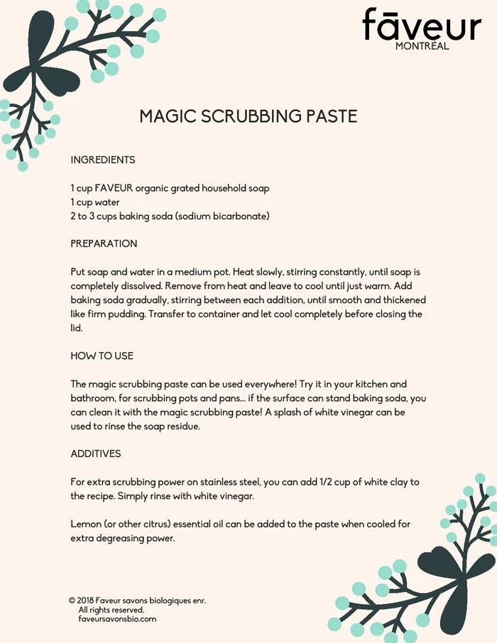 Sodium bicarbonate (commonly known as baking soda) is used in baking, as a cleaning agent, and in many DIY products. One of our favourite DIY products made with baking soda is Suzanne’s magic scrubbing paste (see recipe in pictures). We use it to keep our white store countertops spotless!