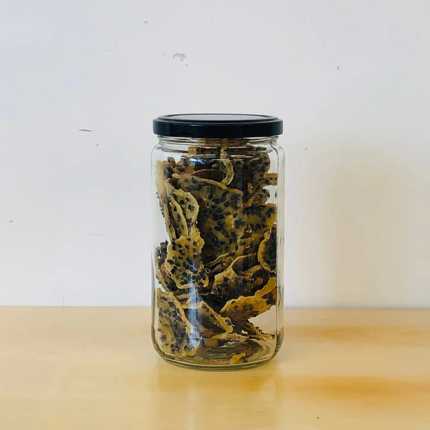 Sold in units of 750 ml – or one full jar – as shown in our product picture. Product is measured, transferred to a compostable brown paper bag tied with an elastic rubber band, and labelled. Net weight is approximately 180 g.