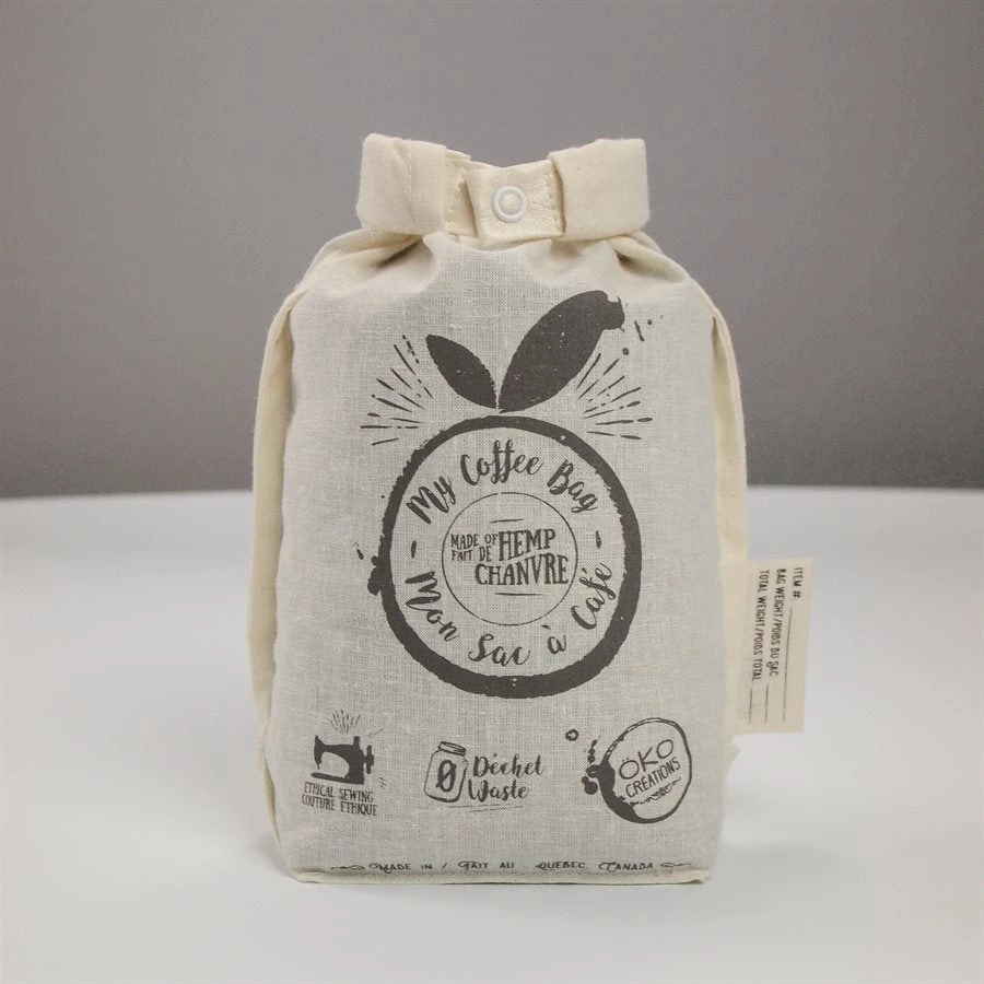 Made of a durable organic cotton and hemp fabric lined with a waterproof, food-grade film to keep coffee or tea fresh. Designed to replace disposable coffee bags, it holds approximately 680 g. With no interior seams or folds, contents don’t get stuck inside. The fabric is printed with water-based dye. Use a washable pencil on the outside label to record the contents as required. The bag closes like a dry bag, creating a handle for easy transport once closed. Dimensions: 19 cm x 27 cm