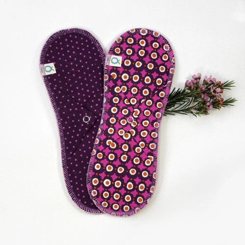 Washable and reusable menstruation pads with an integrated waterproof, breathable polyurethane membrane. They offer excellent protection for normal menstruation flow. Made of certified organic cotton and 3 layers of absorbent hemp. Designed with wings to hold them in place, secured by a snap button. The inside of the pads is natural, the back comes in a colourful seasonal pattern (patterns vary and can be different from the one pictured, but similar in style).