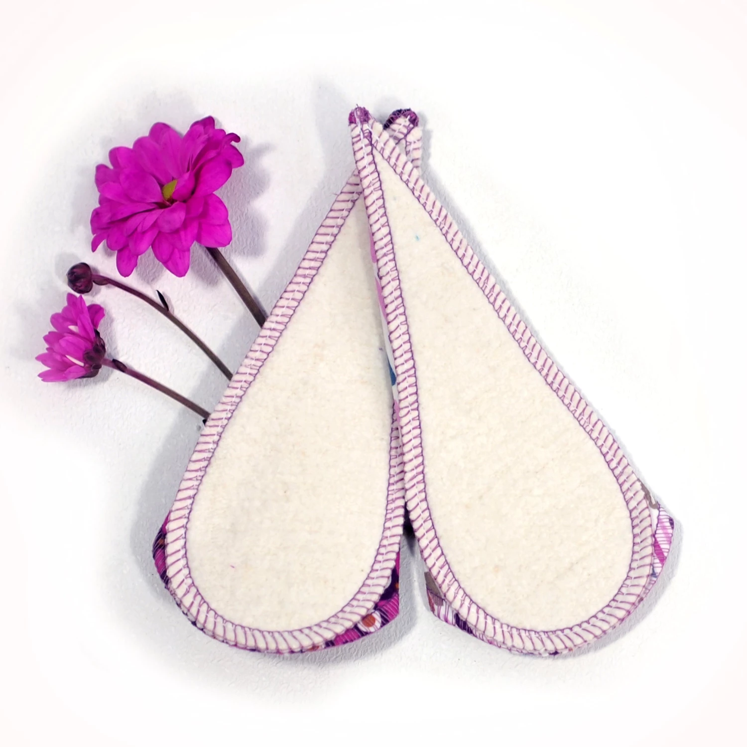 Washable and reusable pantyliners made of certified organic cotton and 2 layers of absorbent hemp. Designed with wings to hold them in place, secured by a snap button. The inside of the pads is natural, the back comes in a variety of purple/pink patterns (patterns vary and can be different from the one pictured, but similar in style).