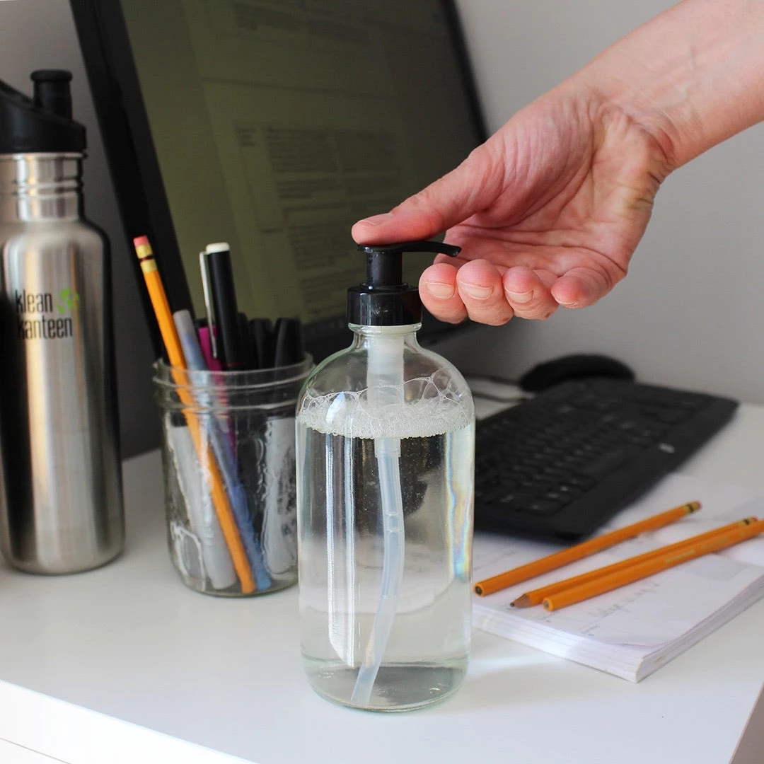 Eliminate germs with our locally-made hand sanitizer, blended with moisturizing aloe vera leaf extract, botanical plant extracts and essential oils. Sold in a 250 ml returnable glass jar. Contains 200 ml of sanitizer liquid. Two refill jars fit in our 16 oz Boston round bottle. Add a pump and leave it on the corner of your desk, kitchen counter… for easy dispensing when needed.