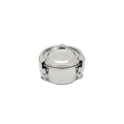 Round airtight container made of 18/10 stainless steel. Closes with three clasps and is completely airtight and leak-proof. This extra small container is 8 cm in diameter and holds 180 ml.