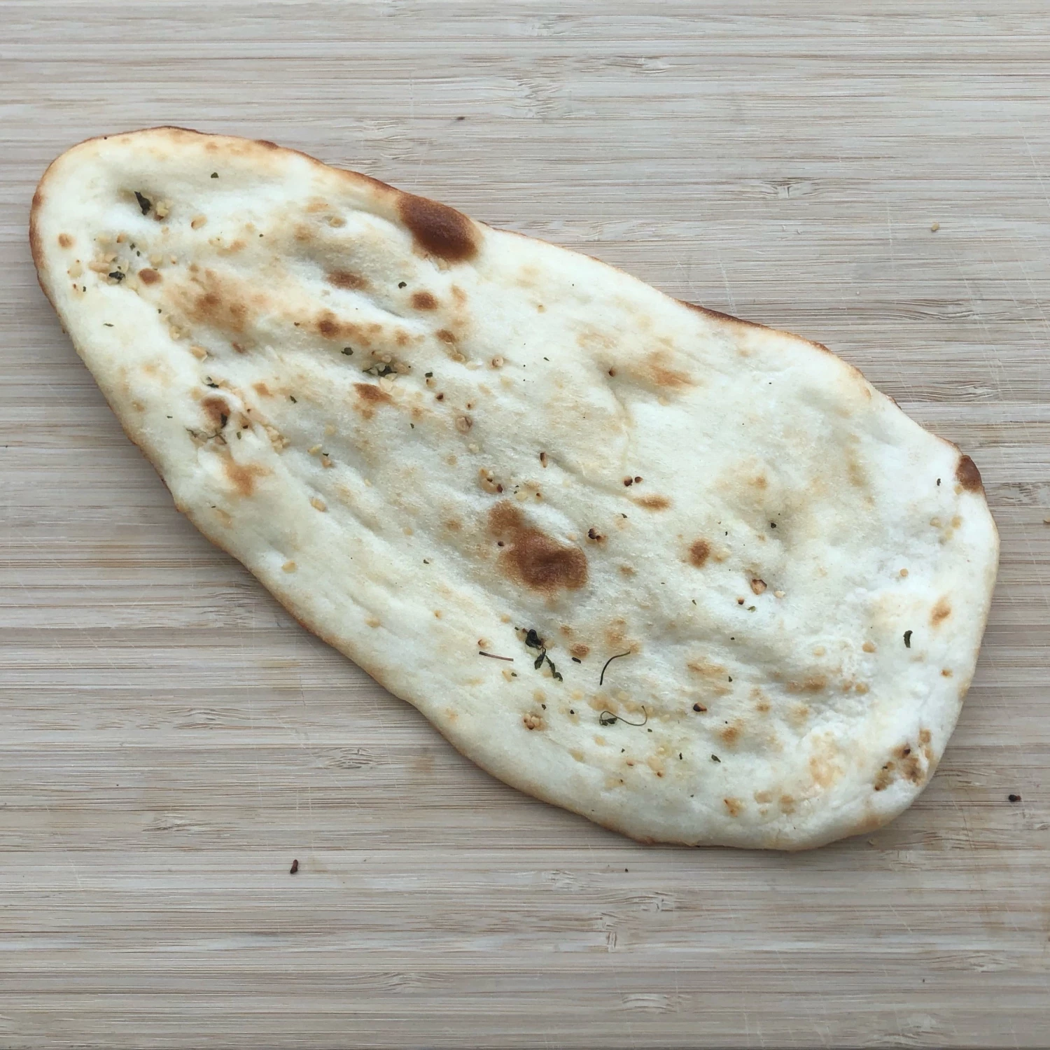 Locally made garlic naan bread. Sold by the unit. Packaged in a brown paper bag.