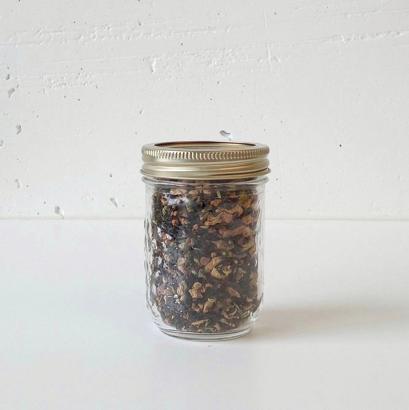 Sold in units of 250 ml – or one full jar – as shown in our product picture. Product is measured, transferred to a compostable brown paper bag tied with an elastic rubber band, and labelled. Net weight is approximately 80 g.